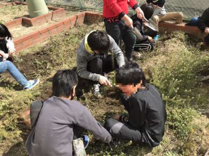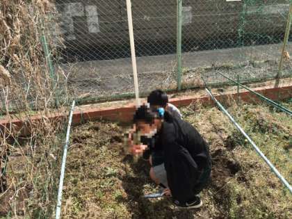 5年生が理科の時間に学習園を掘り返していました。来年の学習のために土を混ぜ、雑草を取り払っていました。他学年のための大切な仕事です。ジャガイモのタネイモも作るそうです。