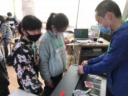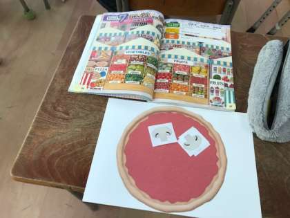 4年生の外国語です。ピザを作るために、先生に材料をもらいます。I want onions.