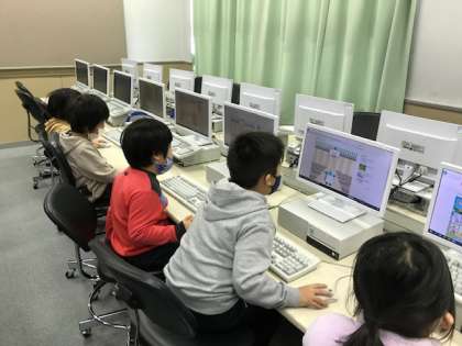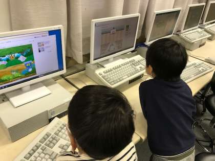1年生がパソコンルームで、マウスの使い方の学習をしていました。タブレットはかなり慣れていますがマウスやキーボードも学習します。