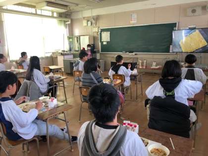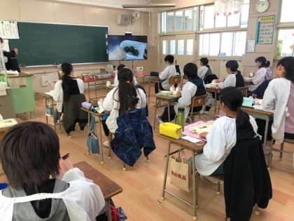 栄養教諭の先生の手作りの給食動画を視聴しています。6年生はとてもうれしそうに鑑賞していました。