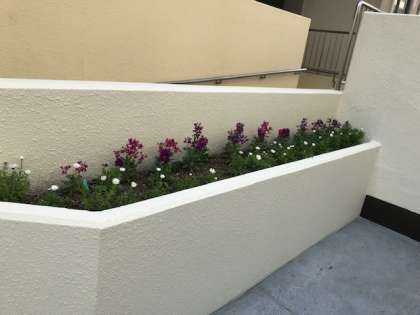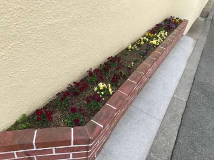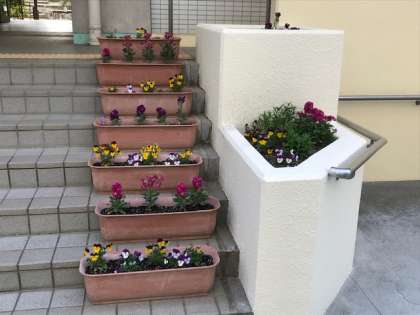 管理作業員さんが寒い時期に植えてくださった花が開いています。子どもたちを笑顔で迎えているようです。