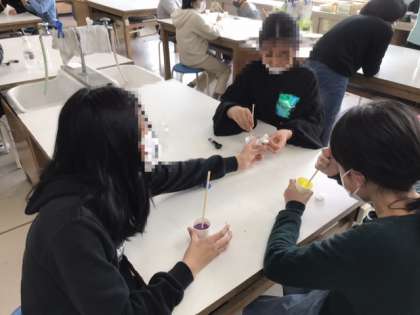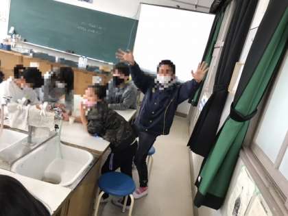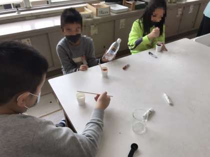 5年生はスライムを作っていました。水のりとホウ酸を使ってスライムを作ります。机を汚さないようにこねます。とっても楽しそうでした。
