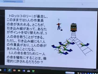 「トロッコ問題」は、倫理学上の問題を取り扱った考察の一つです。小学生には難しいかもしれませんが、子どもたちは懸命に考えていました。この問題には正解はありません。しかし、どのように考えるかが重要です。