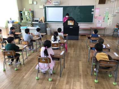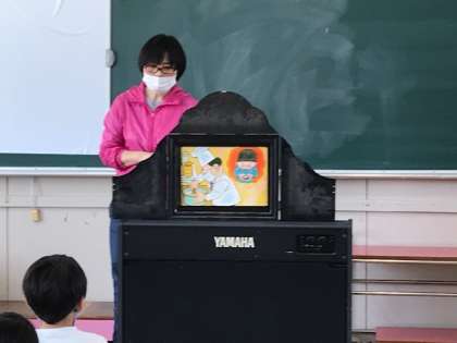 お手紙の片づけが早くできたので、先生が紙芝居を読んでくれました。1年生は、みんな身を乗り出して聞いていました。