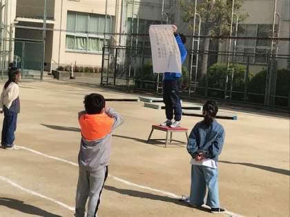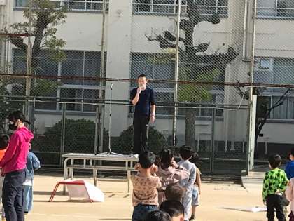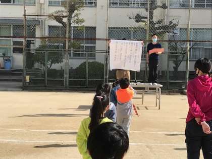 今年度から全校朝会を運動場で行う日も設定しました。感染対策のため1人1人のソーシャルディスタンスを取ります。今朝は校歌を小さな声で歌いました。