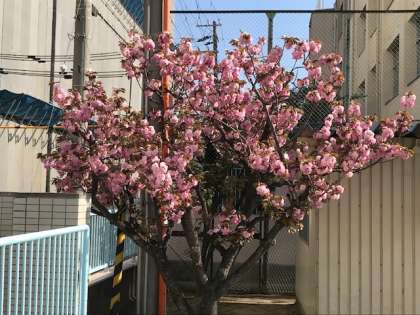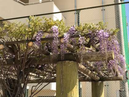 子どもたちが登校し始め、校内の樹木も何か元気です。牡丹桜や藤の花がたくさん咲いています。