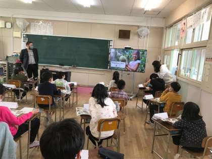 5年生は、外国語科の学習です。今日はさまざまな国の挨拶を発話しました。また、外国語の学習で大切なことは、笑顔、明確な発声、相手の目を見る、反応だそうです。