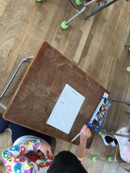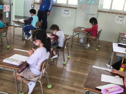 1年生が生活科の学習で、ヒマワリとアサガオの種を観察していました。大きさや形、色に気をつけてカードに絵を描きます。よく見てていねいにかけました。