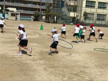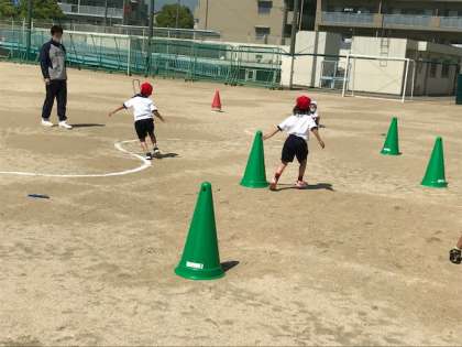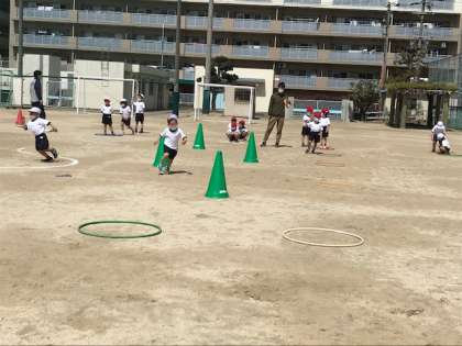 いっぱい走って楽しく過ごした後は、みんなで用具の片付けです。大きなコーンも運びます。