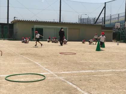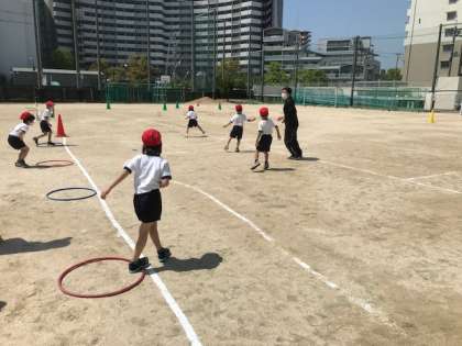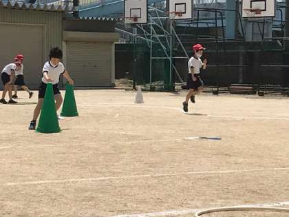 2年生の体育科「走の運動あそび」では、走る距離が長くなり、スピードも上がります。体をうまくコントロールして走ります。