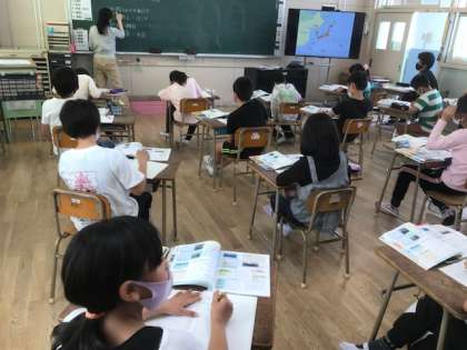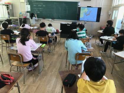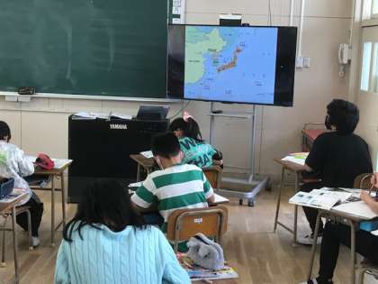 5年生は社会科で日本の国土の周りについて学習をしていました。尖閣諸島は知らないとのこと。学習端末で調べてみるようです。