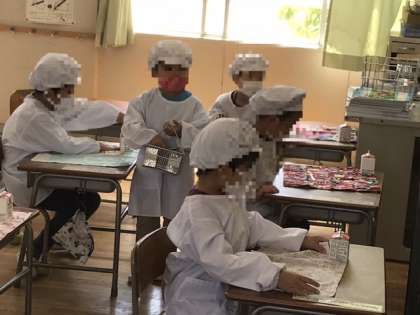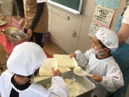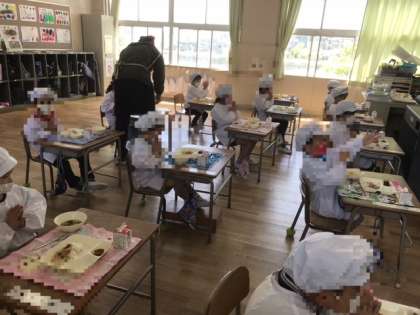 1年生も給食当番を自分たちでします。スプーンや牛乳を配り、ごはんやおかずを入れていきます。みんなで用意して「いただきます。」をしました。