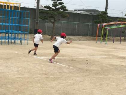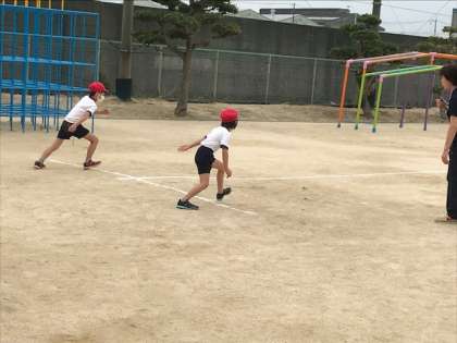 1.2年生が50m走の測定をしていました。去年より速く走れてみんな喜んでいます。