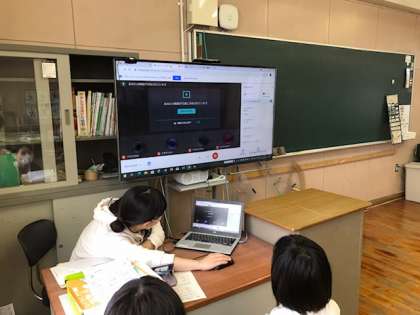 今日の学習のはじめは、なぞなぞです。答えはチャットを使って返答します。4年生はローマ字入力が上達しますね。