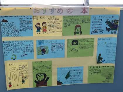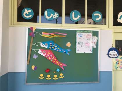 図書室の入り口に5月の飾り付けがあります。友だちが教えてくれている「おすすめの本」も掲示していました。たくさん本に親しんで欲しいです。