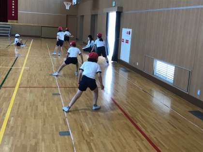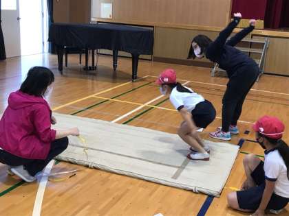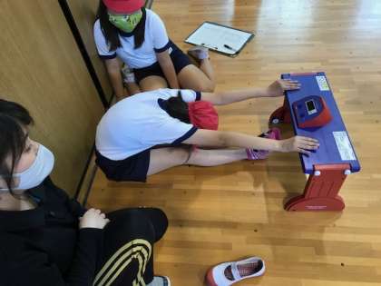 3.4年生が講堂で体力テストをしていました。反復横跳びに立ち幅跳び、長座体前屈を計測していました。記録が伸びたと喜ぶ声が聞こえてきます。