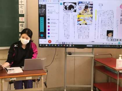 5年生は、デジタル教科書を活用して道徳の学習です。オンライン参加の子の意見を聞いたり、学校で学習する子の意見を聞いたりしながら進めていました。