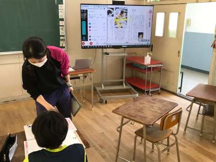 5年生は、デジタル教科書を活用して道徳の学習です。オンライン参加の子の意見を聞いたり、学校で学習する子の意見を聞いたりしながら進めていました。