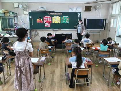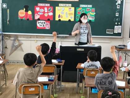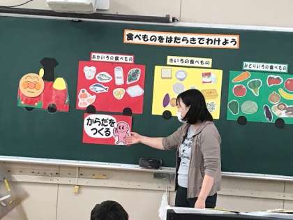 2年生の食育の時間です。「赤、黄、緑色」の食べ物の働きを考えて学びました。しっかり食べてぐんぐん大きくなってね。