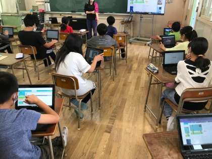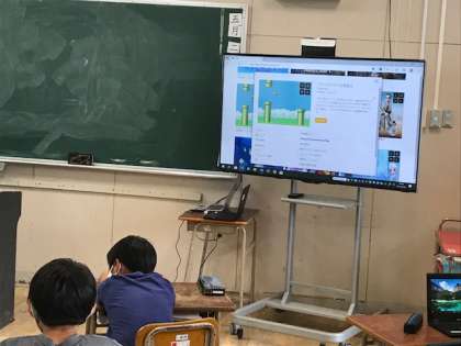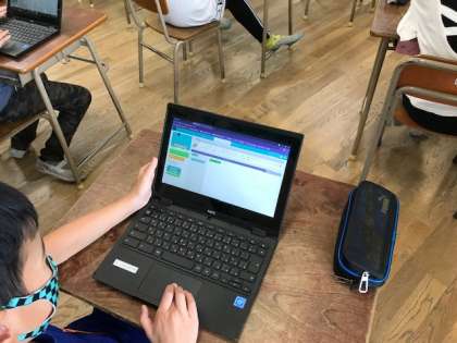 5年生が、1人1台端末を使ってプログラミング学習をしていました。アワーオブコードというアプリを使いプログラムを書いていきます。オリジナリのゲームを作ることができるのでとてもワクワクしていました。