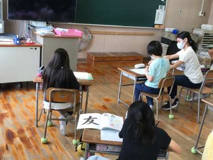 4年生は書き方の学習です。美しい文字を書くために鉛筆やフェルトペンをきちんと持って丁寧に書き進めていました。