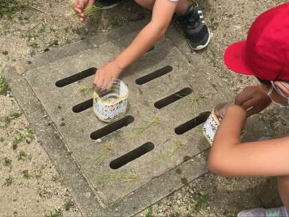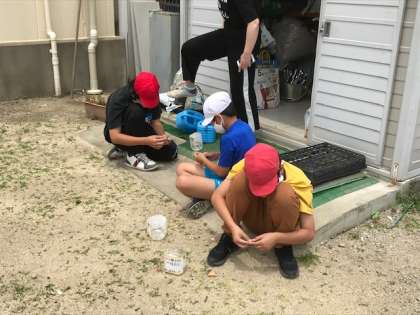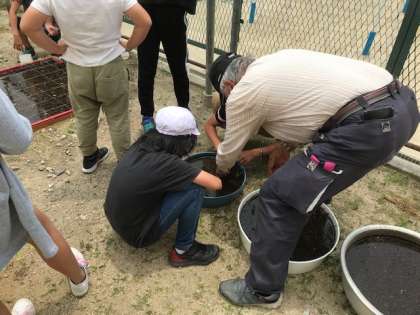 5年生が種もみから育てているイネが田植えできるまで大きくなりました。今日は、坂東さんと藤澤先生に教えていただきながら田植えです。