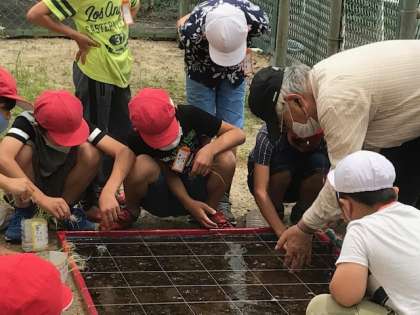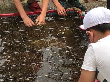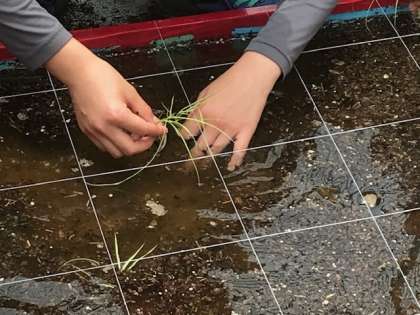 田んぼを区画して、植えていきます。イネが浮いてこないように根本をしっかりと植え付けます。
