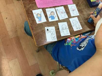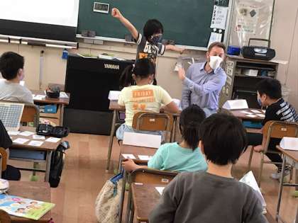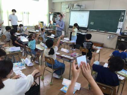 3年生の外国語活動の時間はいつもとても楽しそうです。今日は、「Hou are you?」「I'm〜」を習いました。ジェスチャーをして当てます。「I'm fine.」「I'm tired.」などとても上手にジェスチャーをしていました。