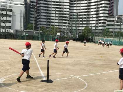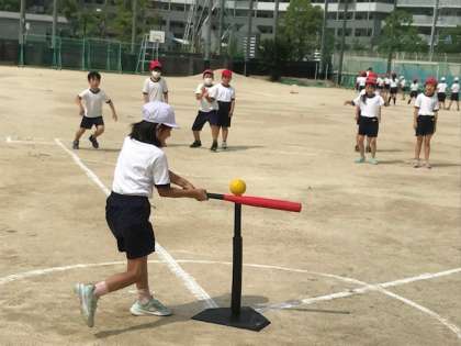 3年生が体育科の学習で「ティーベースボール」をしていました。今日はキャッチボールとバッティングをして、ルールの確認をしました。
