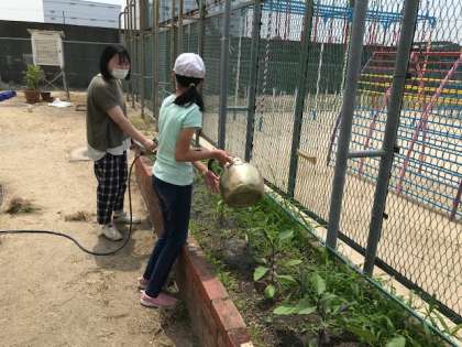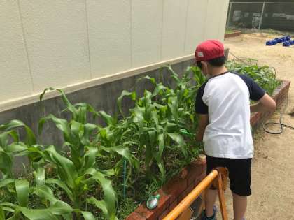 池島小学校では、給食委員会の子どもたちが栽培活動もしています。ナスとトウモロコシに水をあげていました。