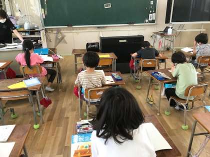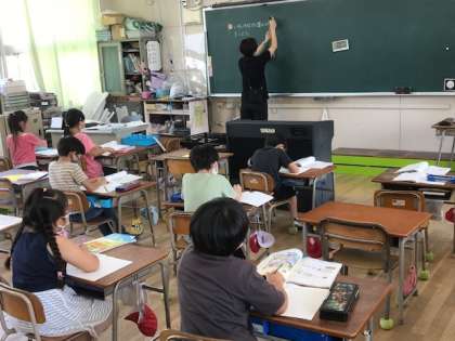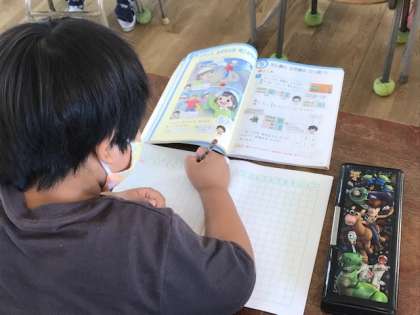 2年生はの算数科の学習です。足し算の筆算について学びます。だんだん難しくなりますが、ノートを書く様子は真剣そのものです。