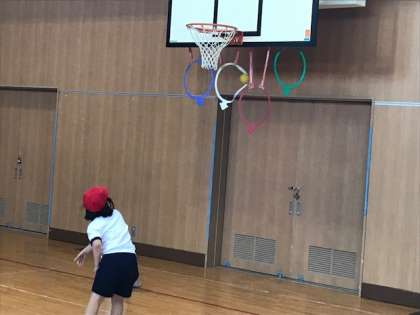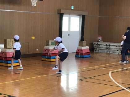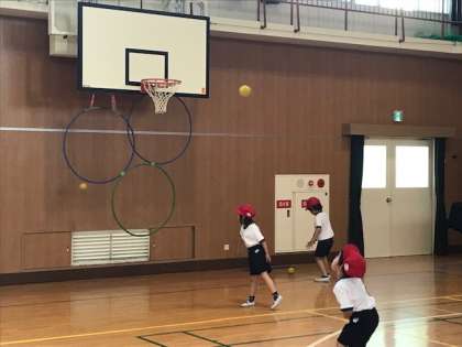 1年生の体育科「投げる運動遊び」です。いろんな的に向かってボールを投げます。投げる方をよく見て投げ方に気をつけて遊んでいました。