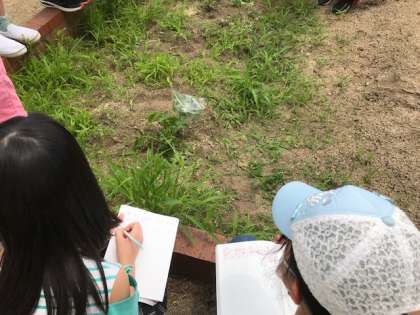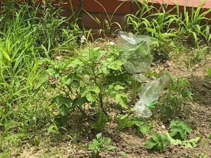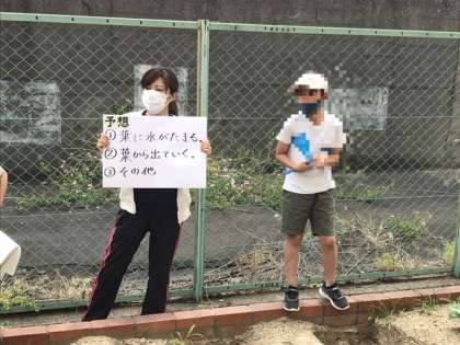 6年生の理科で植物の蒸散作用の学習をしていました。ジャガイモの葉から水が出ているのか?袋をかぶせて観察です。