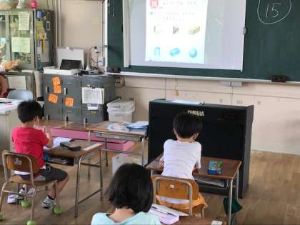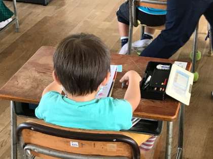 1年生はドリルを使って「いろいろなかたち」の問題をしていました。この年齢では、本物の箱などから印刷の形を結びつけるのは難しいのですが、みんなよくできていました。