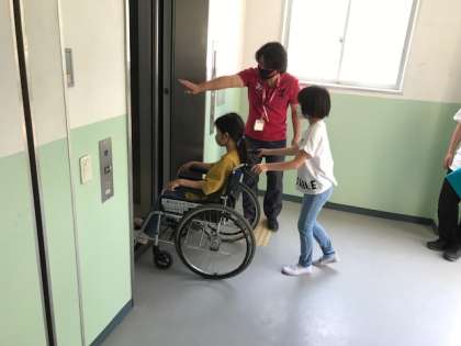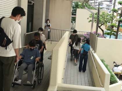 長いスロープをゆっくりゆっくり登り降りしました。エレベーターへの乗り降りは難しいです。