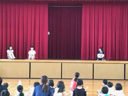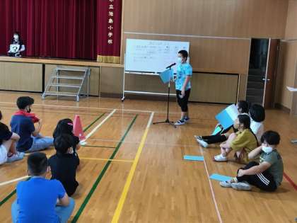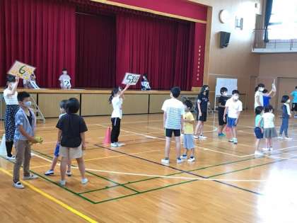 広報委員会の司会で児童集会の開始です。「距離をとりましょう。大きな声は出さないでください。」と感染対策を意識した注意の後、ゲームの開始です。