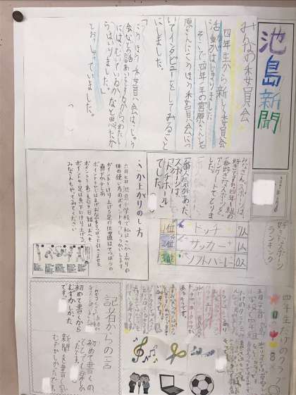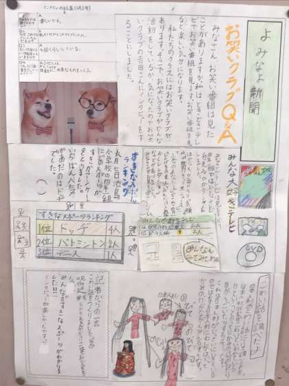 4年生の教室に学級新聞が掲示されていました。アンケートを入れたり、興味を引く記事を書いたりしています。編集後記までしっかり書けていてすごいですね。