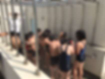 今日は絶好のプール日和です。1年生2年生は、初めて池島小学校の大きなプールに入ります。感染予防のため歓声はあげずに頑張ります。シャワーの水はまだ冷たいですね。