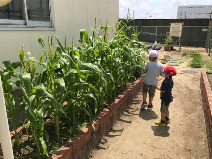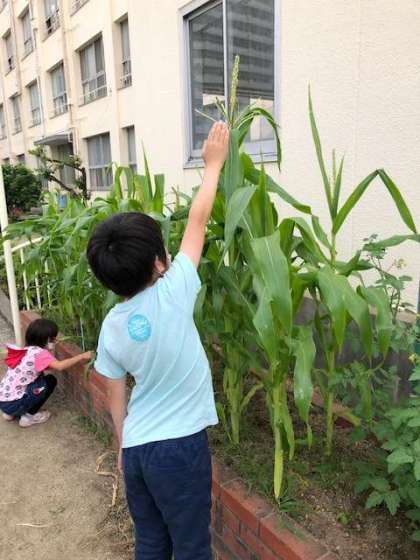 給食委員会の4年生の子どもがトウモロコシと背比べをしていました。このところの日差しと雨の水分と豊かな土のおかげでグングン大きく育っています。1年生は、自分たちのアサガオの水やりが忙しそうでした。