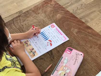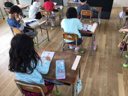 1年生の算数科で、たし算の文章問題を解いていました。「合わせて〜」を見つけたら足し算ですね。式も答えもきちんと書けていますね。