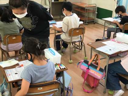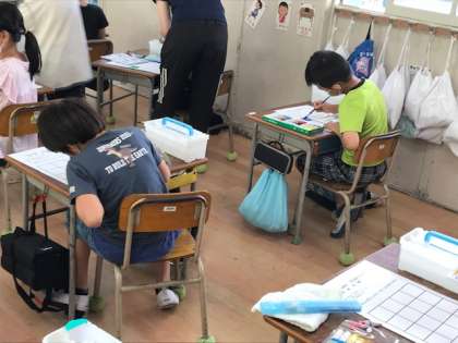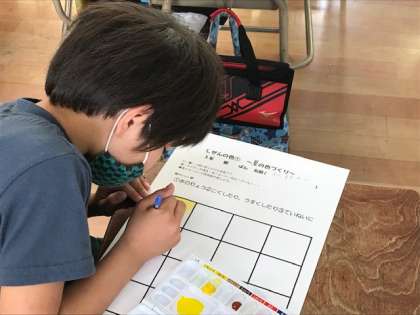 3年生図工科です。夏の色をイメージして画面に絵の具を置いていきます。水の量を調整して濃淡をつけます。画家になった気持ちですね。