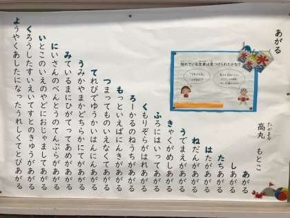 今月の詩は、元教員で詩人の高丸もとこさんの「あがる」です。一文字ずつ増えるおもしろさと、文頭にも文が隠れているおもしろさがあります。こんな詩を作れるといいですね。