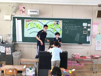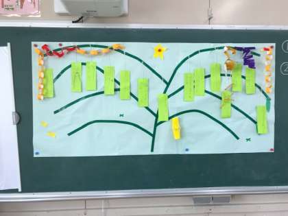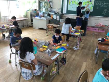 1年生が図工の時間に七夕の笹飾りを作っていました。みんなたくさんの願いごとを書いていました。
