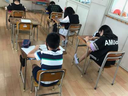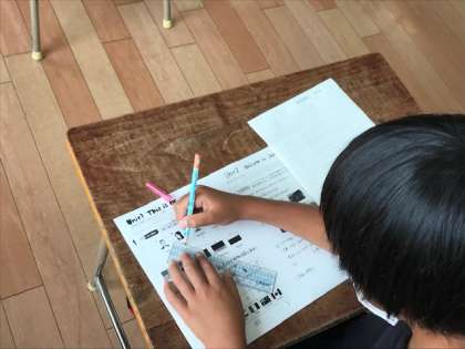 6年生が外国語のテストをしていました。初めはlisteningです。よく聞いて選択肢から選びます。外国語は耳から育つと身に付きますね。
