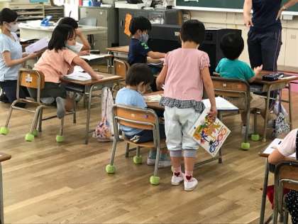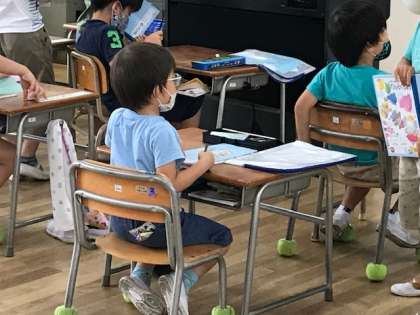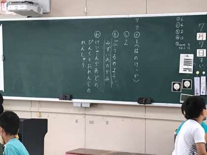 1年生が連絡帳を書いていました。黒板の文字を見て、ひらがなでていねいに書きうつしていました。その後は、係の人がカタカナノートを配り、カタカナの学習です。自分たちでできることが増えましたね。