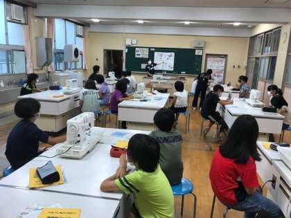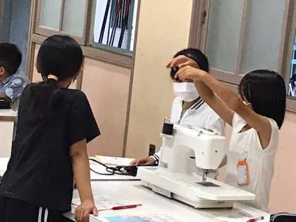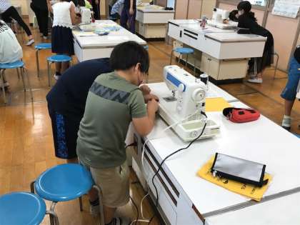 5年生は、前回の時間には糸を通さずにミシンを動かしていましたが、いよいよ糸をとおします。下糸の巻き方、上糸のかけ方を学習していよいよミシン縫いです。