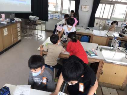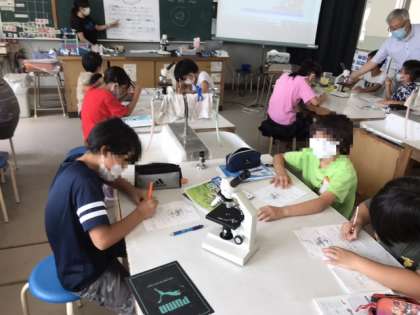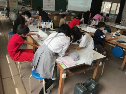 5年生が理科の時間に顕微鏡の使い方を学んでいました。接眼レンズに対物レンズ、ピントを合わせてのぞいていました。最近の顕微鏡には光源が付いていてとてもよく見えます。
