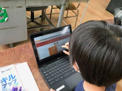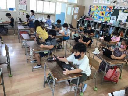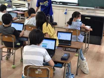 3年生が総合的な学習の時間に、1人1台端末で「心の天気」を自分で入力する方法を学習していました。その後、プログラミングアプリの「scratch」の使い方を学習しました。