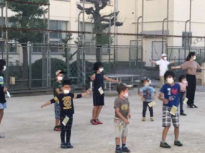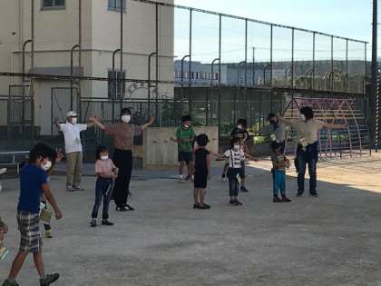 ぬけるような青空の下、子ども達は元気にラジオ体操第1と第2をしました。第2は難しいようです。でも、しっかり体を動かしていました。
