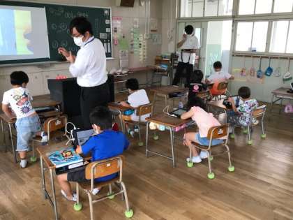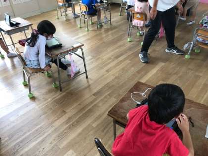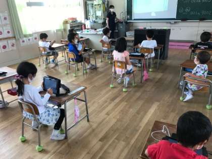 1年生が、タブレット端末に外付けのルーターをつけて、インターネットに接続する作業をしていました。ICT支援員さんにも教えてもらいながらがんばりました。